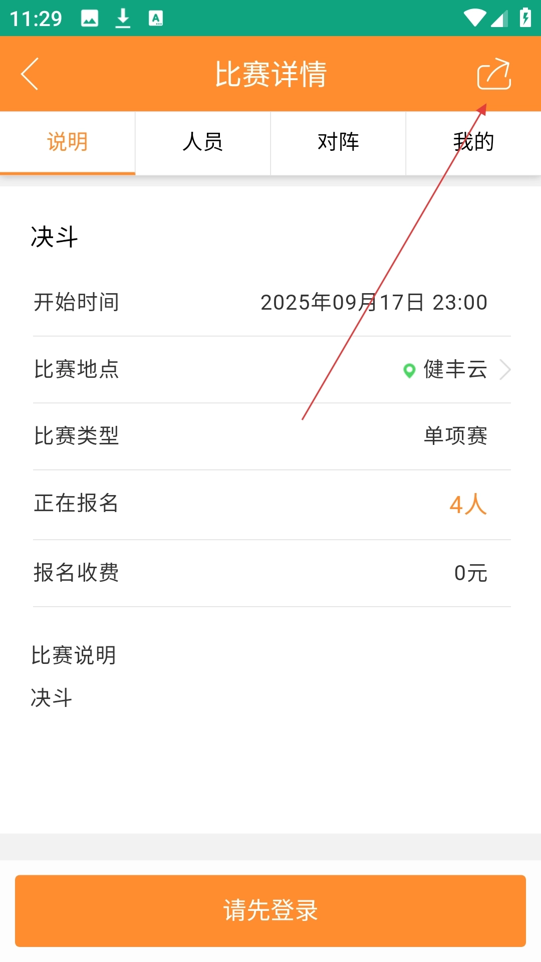 3、在赛事详情页面,点击右上角的【分享】按钮,即可打开分享选项。