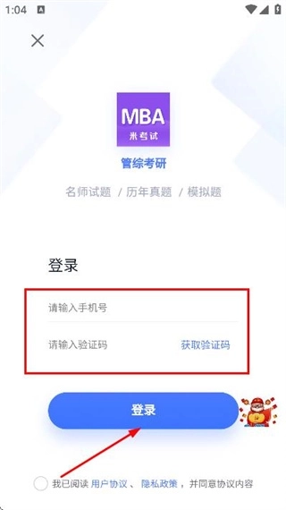 3、在登录页面填写手机号和验证码,勾选协议后,点击登录完成账号登录操作。