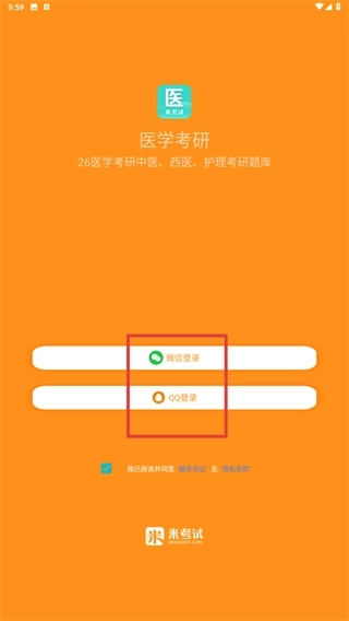 2、在登录页面选择【微信登录】或【QQ登录】选项,通过对应的社交账号完成登录流程,即可进入医学考研的功能界面。
