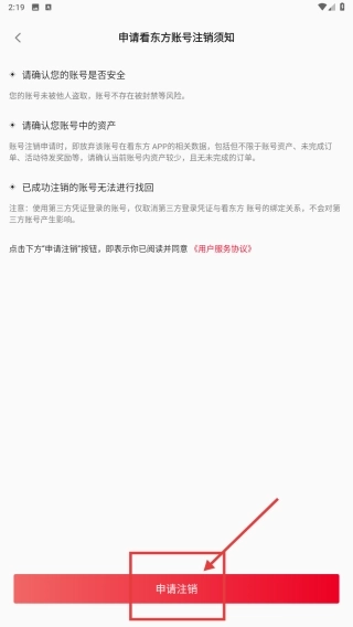 4、进入注销须知页面后,点击申请注销按钮,即可启动账号注销流程。