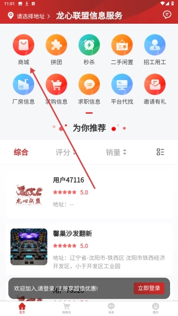 1、进入龙心联盟信息服务页面后,找到并点击【商城】图标,即可进入商城界面。