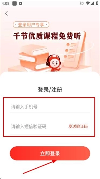 4、在登录页面填写手机号和验证码,勾选协议后,点击登录完成账号登录操作。