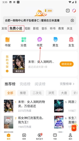 1、启动悟空浏览器应用程序,在主页面找到并点击【免费小说】选项,随后进入【书荒】相关的书籍列表页面;