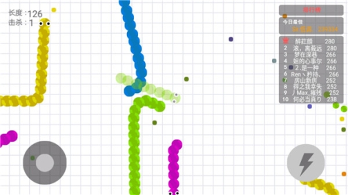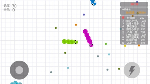 控制摇杆走位玩家的小蛇,吃掉地图上彩色的小光点,就会变长。