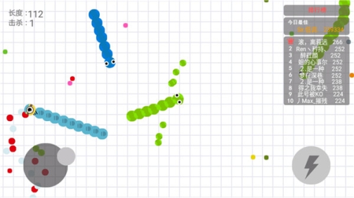 游戏联网,时间限定10分钟。长按加速键,用巧妙的走位让蛇身被别人撞上,即可以吃掉他们。