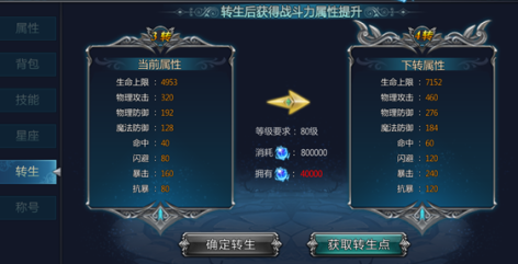 1.玩家在80级的时候可以开启转生系统,通过点击角色按钮进入到转生界面当中去;