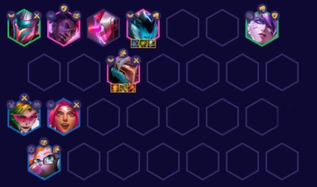 1、阵容构成:佐伊+阿利斯塔+娑娜+安妮+艾克+乐芙兰+索拉卡+努努+迦娜
