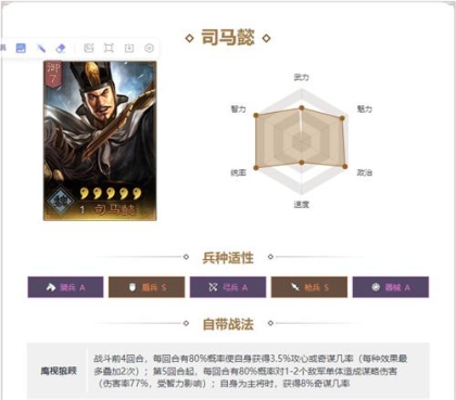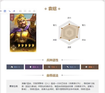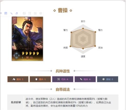 武力统帅速度都较为优秀,有稳定群体输出,搭配盛气与许褚,减少对方50%统帅,基本完全削弱对方防御,以最快速度击溃敌军。