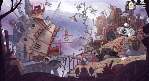 7、往右走,拖动打开所有包围直升机的巨大花瓣。然后调整投石机关,使石头投射在3个藏有黄色虫子的地方。最后切换角色为小女孩,进入直升机,前往下一个星球