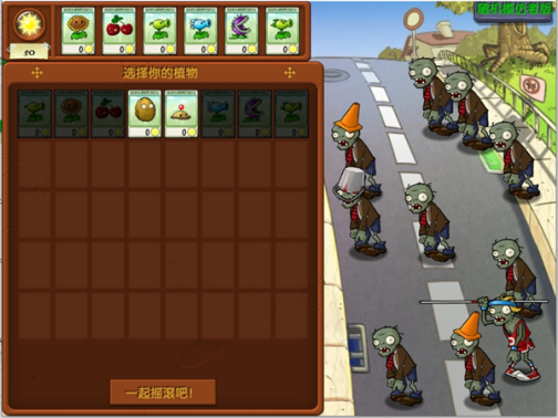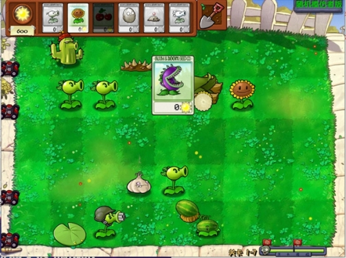 1、进入关卡,常规性的选择植物,必带向日葵和樱桃炸弹哦,其它无所谓,因为进入游戏都会变成模仿者;