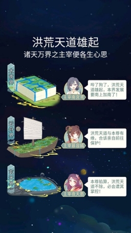 西华至妙之气化生而成,女仙之首,是为西王母;天地间第一个灵棺所化,是为燃灯道人;而混沌之中的一只蛐蛐,是为鸿钧道祖。游戏中,随着时间流逝,红云老祖、望舒仙子、镇元子、元始天尊、魔祖罗睺、鸿钧老祖等大能纷纷诞生出世,助力洪荒天道掌控诸天万界