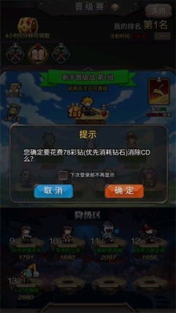 那么晋级赛可以随时PK么,答案是肯定的,但是有CD限制。每PK一次就会增加10分钟CD,但CD超过30分钟的话就无法继续PK,需要等到CD冷却低于30分钟后才能继续进行。CD时间可以通过钻石进行消除,消除的CD时间越短,所消耗的钻石越少。