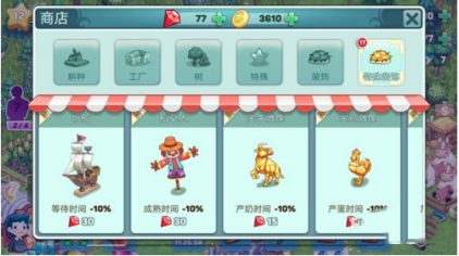 商店系统里丰富的内容,让你不得不感叹钱到用时方恨少啊,基础设施体系里玩家可以用钱购买搭建土地、鸡舍、奶牛牧场、猪舍等基础设施;动物体系里玩家可以购买到鸡、牛、猪、羊等农家小动物来饲养,并利用它们赚钱;高级搭建里玩家可以搭盖面包房、饲料厂、糖厂等大规模工厂;植物体系和装饰体系里玩家可以种植自己喜欢的树,购买各种各样美丽的装饰物,将自己的农村打扮的更漂亮。