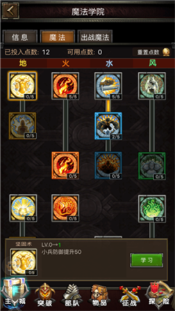 概述:在魔法学院中,可以对英雄和佣兵的各项属性和魔法进行学习研究,从而提升作战能力。魔法的等级越高,佣兵们的魔法伤害就越高。主要由信息、魔法、出战魔法三部分组成。