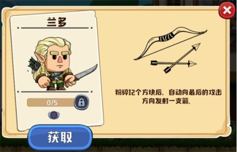 击碎12个方块以后,将会向最后击碎最后一块方块时的英雄方向射出一支箭,被箭击中的怪物(除了幽灵)会被直接击杀。无法击碎箭飞行路径中除怪物外的任何东西。需要5个兰多碎片即可获取该英雄。