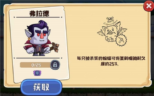 技能:每只被杀死的蝙蝠可以恢复鹤嘴锄25%的耐久度