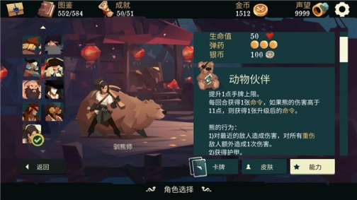 驯兽师血量50,弹药3,初始牌组强度高。能力相当于自带伪遗物皇冠,熊的伤害按理论思路可以无限叠加,但要配合镜像和换牌。前期能给相当客观的伤害和护盾,后期一些牌组也有不错的用处。