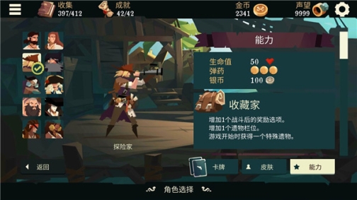 探险家血量50,弹药3,有很不错的初始牌组。探险家的强度在于抽牌选项多,可以多一个遗物栏。如果再有个眼球遗物,抽卡选项就会有五个,大大增加抽到想要卡牌的几率,事实也正是如此。并且有一张临摹卡,也可以帮助探险家前期满血过渡。