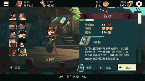 占卜师血量40,弹药3,是目前血量最低的,但有3次复活机会,初始卡牌不算太强。前期过渡一下伤害,后期还是依赖流血撕裂,占卜师强在于自带3次复活,也就是说在竞技100前你可以浪2次。另外被动说能知道战斗时卡牌顺序,但实战我感觉没有体现,这点还需要有人指点一下。