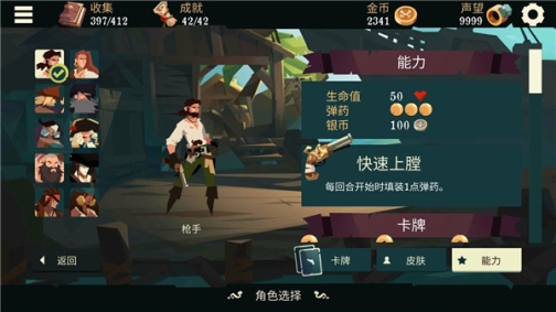 枪手血量50,弹药3,初始牌组中规中矩。枪手的强度在于被动每回合填装弹药,相当于自带遗物铲子且不占遗物栏,可以说这个被动给了枪手在竞技场较高的地位。因为没回血,竞技场前期尽量快速拿镜像,没有就拿能叠盾的。