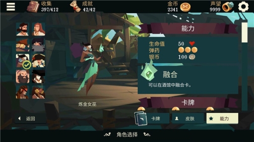 女巫血量50,弹药3,初始牌组中规中矩。女巫的强度在于前期可以抽一些稍差的卡牌融合成新卡,可以快速攒金币来抽适合竞技场的卡牌。但后期还是要注意避免卡牌过多污染牌组,巫女没有弹药补给,只有通过融合生成弹药补给。
