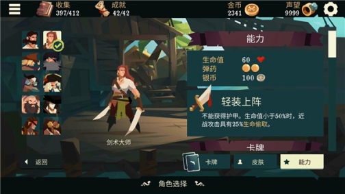 剑术大师血量60,弹药2,初始牌组中规中矩。剑术大师不能叠盾,因此后期需要注意高伤害敌人,因此初始牌组灵活很重要,再配合近战卡牌传奇宝剑生命偷取保证血量安全,另外遗物最好还是带腰带,毕竟弹药吃紧。