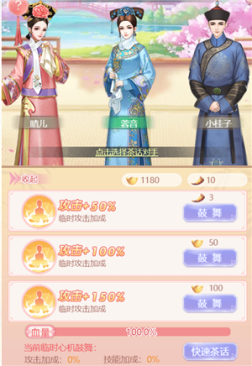 游戏中当然不能缺少和其他玩家pk的玩法,茶话会应运而生。小主们会派遣伙伴们舌战群雄,与其他小主的伙伴进行友(ming)好(zheng)交(an)流(dou)。 茶话会的入场条件是拥有8个伙伴后,点击出府-御花园,即可参与。所以小主要努力解锁伙伴,完成主线任务和通关剧情都可以解锁伙伴。茶话会是单兵作战的地方,开场和每一轮战斗完毕都可以购买BUFF来提升伙伴的属性加成或者回复部分血量,不要小瞧这些BUFF噢,说不定最后能帮助小主以弱胜强呢。