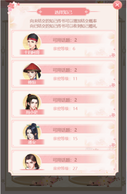 一封锦书寄相思,飞鸽传书是游戏的特色玩法之一,知己们不在身边怎么办?这时候就需要靠信鸽来传情达意~提升知己的亲密度之后,可以解锁话题,小主每次可以通过飞鸽传书与知己们展开话题剧情,根据小主的不同选择,剧情也会走向不同的结局。在一段甜蜜暧昧的剧情之后,可以提升知己的亲密经验以及知己的属性。