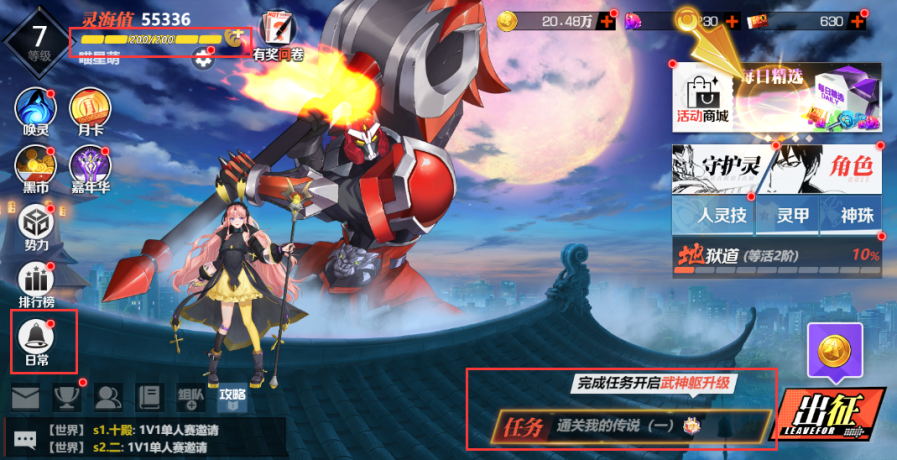 当新手流程走完后,等级逐渐慢下来后,体力还会有剩余,这个时候可以去主线副本-进攻灵域找一关3星通关的进行扫荡主线,可以快速获得经验值进行升级。如果体力不够了,可以去黑市的每日商城领取每日免费体力,或者花点魂晶购买体力。