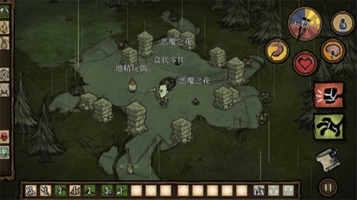 8、该游戏最有特色的还是它的天气状态,并且游戏有饥饿、白天黑天等设置,玩家可以生火、可以建造庇护所等,黑夜一定要点燃火把,不然会被血条会一直掉,坚持活下去。