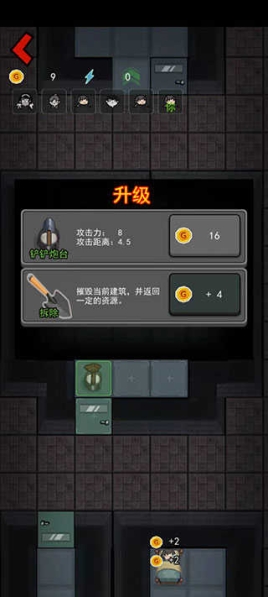 (2)进入房间后升2级床2级门接着一直升到8金币/s后开始造4个炮台