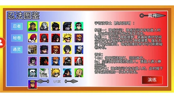 3、进入【图鉴】界面,我们可以看到每个忍者的技能属性,以及秘卷和通灵的相关说明,
