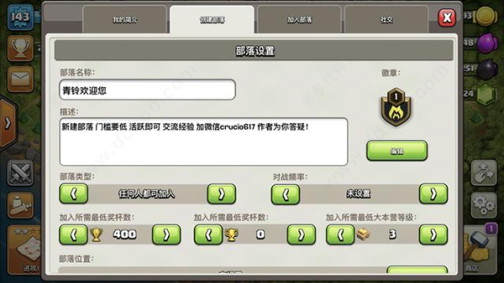 2、将部落标签设置为“捐兵 友好 欢迎新手”;主世界杯段调整为100-600杯;任何人均可加入;说白了就是不设置任何门槛从游戏中收人,只要开门的时间够长,一定会有小号进来,每进来一个人都要打招呼接待并及时给予援兵,只要高级援兵及时到位,很多小号就会留下。在旧收人机制下,一般1个小时就能收到20-30个新手小号,但在新的收人机制下大概6个小时才能勉强收够10-15个小号,这需要首领有足够的耐心。当部落有一定稳定人员和部分高本后,即可去各种APP发布招人贴,进一步扩大规模,提升人员质量。