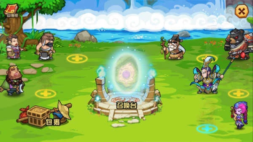 英雄可点击左下角的猴、猪头进入,点击召唤台可随机召唤英雄,英雄可进行体力、攻击、防御和技能等属性点的强化养成,而且升级可大大的增加战力。