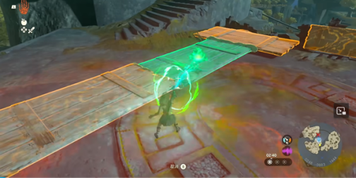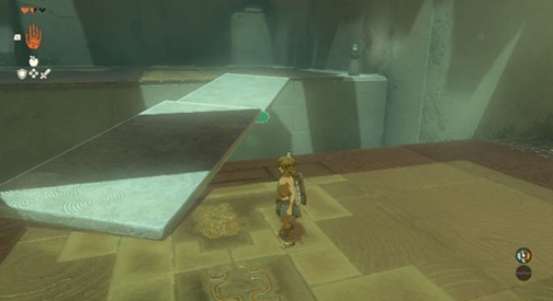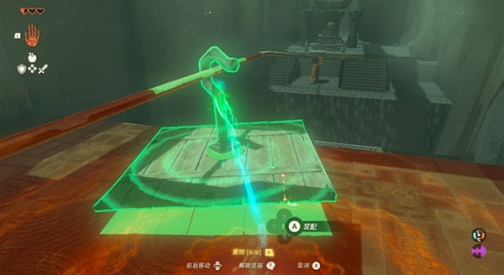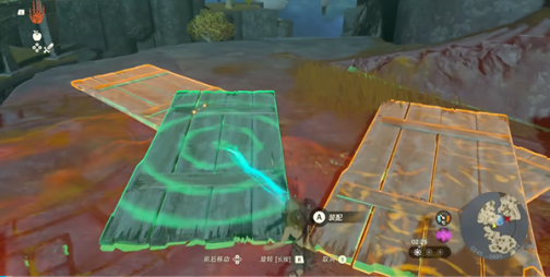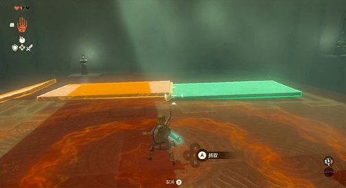 3、第一个过道坎,玩家首先开启究极手的功能,按住R键,将前面的石板移动到过道坎上,平放下来,然后玩家走过去就可以了。