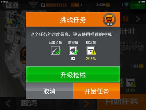 说了这么多是不是有点晕了?其实在狙击行动代号猎鹰中,只要我们进入关卡,游戏就会自动提示我们所需要采用的枪支种类和所需的枪械参数,如果你的武器低于推荐配置,游戏就会在相应参数下显示一个叹号。所谓工欲善其事必先利其器,如果武器太差,一枪打不死人或者打偏了可就尴尬了!