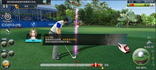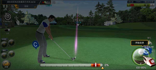 当使用木杆、铁杆与挖起杆等三种类型的球杆挥杆时,打击计量表除了强度指标外,在计量表的右方还有强度指针。点击右下方的小白球图标后,计量表里的能量就会向左方跑动,能量跑动时第一次轻点面版就会决定挥杆的强度,当能量接近右方的甜密点指针时,再轻点第二次,就能决定小白球是否正中球头,让小白球更接近预估的落地位置。