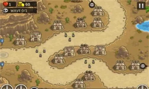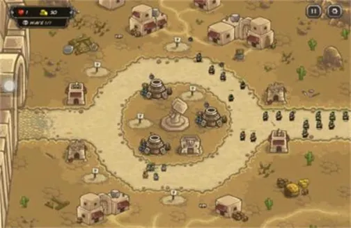 攻略:本关的重点在于死守中央路口,初始布局建议左侧弓箭塔,魔法塔;中下部弓箭塔,炸弹塔;右侧弓箭塔;中部步兵塔,弓箭塔(参考图片一)。有资金后在中部补充1座弓箭塔,1座步兵塔以稳固中央防守,增援还是冷却就用。然后升级,本关的塔可以升1级,优先升级中央的步兵塔,然后是左侧的魔法塔,再后是中央的弓箭塔和中下的炸弹塔。本关二级沙漠兵较多,在其于中央集中时用火雨。后期可酌情在后方补箭塔,总的来说本关难度不大,我通关时还有600多金。