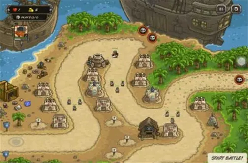 策略:首先在中心位置建造3个炸弹塔,呈三角形排列。一旦增援冷却完毕立即使用。对于个别漏网之鱼不必慌张,因为后方有一个NPC箭塔会帮你处理。有了足够的资金,就在中心补充步兵塔,优先升级上面或下面的,然后再升级后面的,与增援部队配合可以轻松防守。如果资金充足,也可以适当增加炸弹塔的数量。面对最后一波敌人,使用增援兵力进行隔断和阻挡即可。