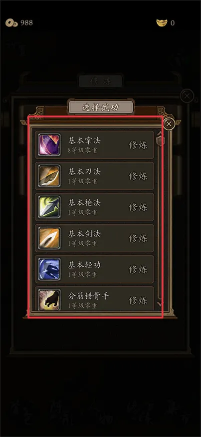 5、另外在修炼界面中,玩家还可以通过修炼武功来增加技能