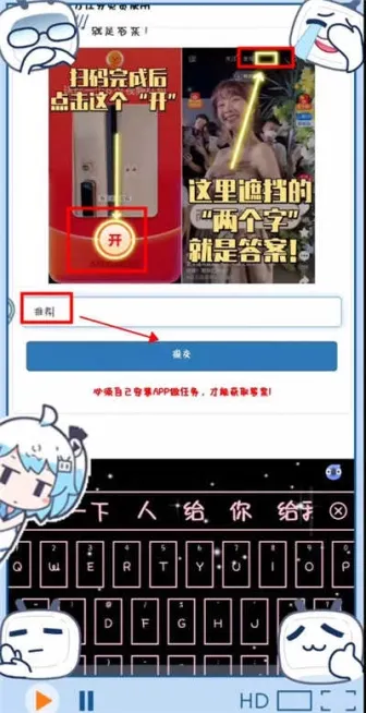 3、下面就是任务问题和答案,扫描完成后点击如下图所示的开,就能够看到被遮挡的两个字,就是答案,小编这里的画质box答案是推荐,输入即可,记住这个答案不是固定的,必须自己安装app做任务,才能够获得答案!