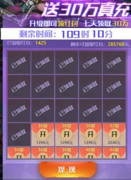 1、开局参与全民冲级领30万真充活动,等级越高,领取的钱包余额就越多,活动是开服7天内均可参与,保持活跃即使不充钱也能玩得很舒服!