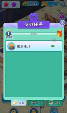 2、下面开始修复奶茶店,先摆放些新茶几,点击任务,开始重建集市,摆放茶几需要消耗1颗红星