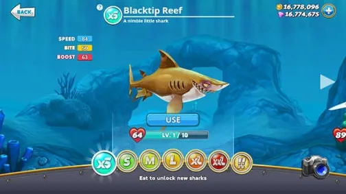 1、可以收集各有7种不同大小的20类鲨鱼品种,扮演敏捷的双髻鲨,甚至到著名的大白鲨!