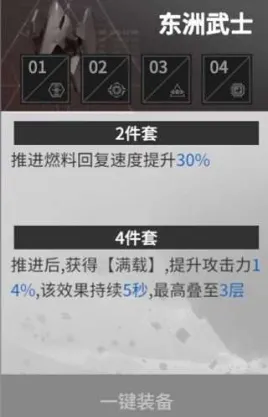东洲武士几乎是为潘朵拉量身定做的套装,推进燃料回复速度提升给了她更大的操作空间,而推进后获得的满载buff更是几乎可以全程覆盖,在需要爆发是也可以连叠三层,配合大招打出极为不俗的伤害。