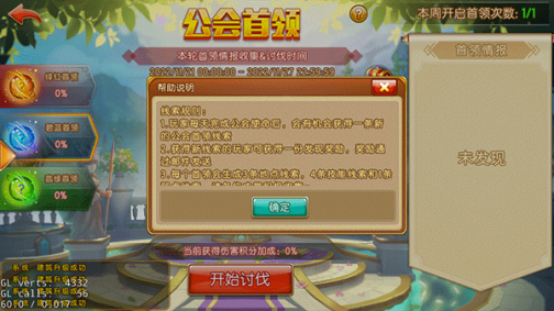 公会成员完成公会使命可获得首领情报,会长根据情报线索开启对应的boss以及选择相应的场景,开对则有相应的伤害加成。玩法详细规则可在“公会首领”界面点击上方的“?”帮助说明查看。