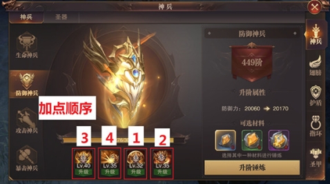 解析:防御神兵系统所有角色优先第三层“圣灵神佑”,冷却时间8秒非常短,在超过20%生命值伤害时伤害上限,让自己更有可持续性作战能力;其次除角色在600级之前可选第一层“圣灵强体:基础防御力百分比提升”,在600级以后玩家建议全部选第四层“圣灵自愈:受到攻击时10%概率提升大量百分比生命值”,因为在6转之后各个角色的忽视防御和无视属性的大量提升,第一层基础防御力百分比提升已经没有很大的意义,最后一个可选第2层“圣灵后发”加技能伤害,或者也直接放弃。