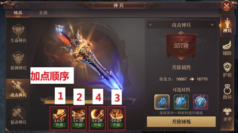 解析:攻击神兵系统所有角色优先第一层“无双武勇:人物基础攻击力百分比提高”,其次选择第二层“无双巧技:永久技能伤害替高”,再选择第四层“无双神威:额外的群体伤害”,第三层“无双狩猎”可以直接放弃或者最后加持。