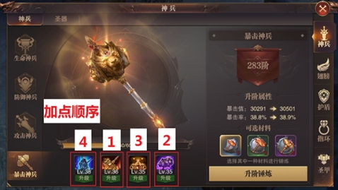 解析:暴击神兵系统材料是比较稀缺的,在日常礼包和平时的节日活动中才会有,所以属性的提升也是神兵系统中最好的,那么我们核心中的核心所有职业优先选择第二层“战神破灭:PVP伤害永久百分比提升”,其次选择第四层“战神嗜血:将伤害转换成生命中回复持续3秒”,再往后面就是选择档期第三层“战神狂热”和第一层“战神不屈”。