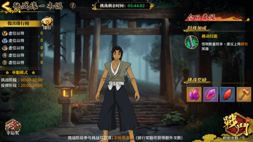 1、挑战缘一木偶分为单服模式与跨服模式,单服模式每周有7期boss,周一10:00-20:00可进行挑战,周二至周日0:00-20:00可进行挑战,跨服模式每周有3期boss。分别在周一、周三、周五进行挑战,挑战持续一天,每期boss挑战结束后可进行投掷,投掷结束后,可领取投掷奖励。